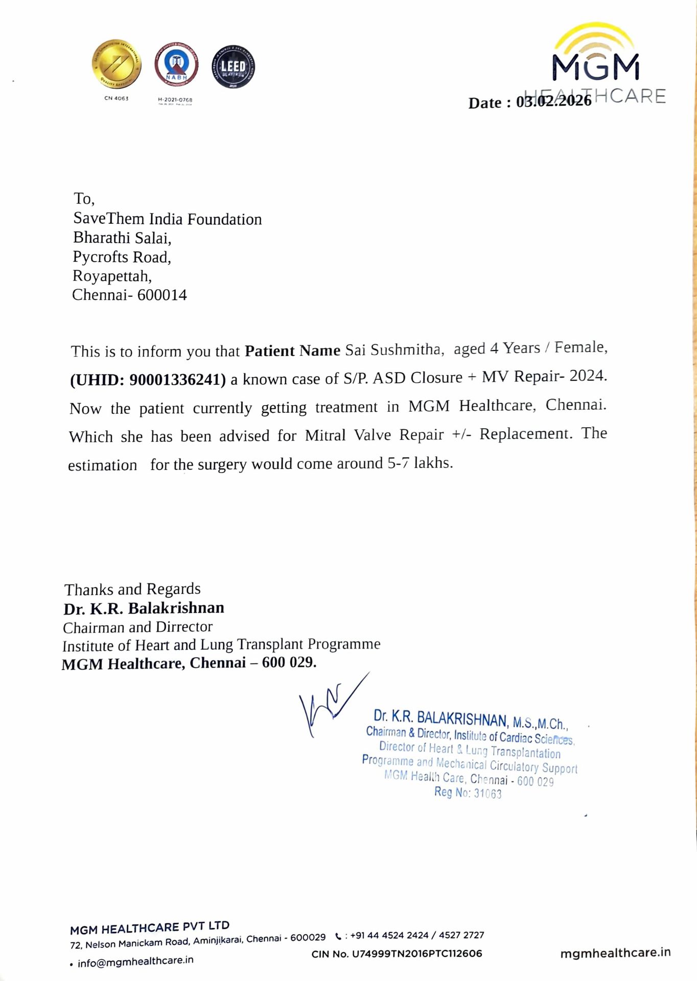 Your support can help Sai Susmitha receive timely heart surgery and give her a chance at a healthy, happy childhood.